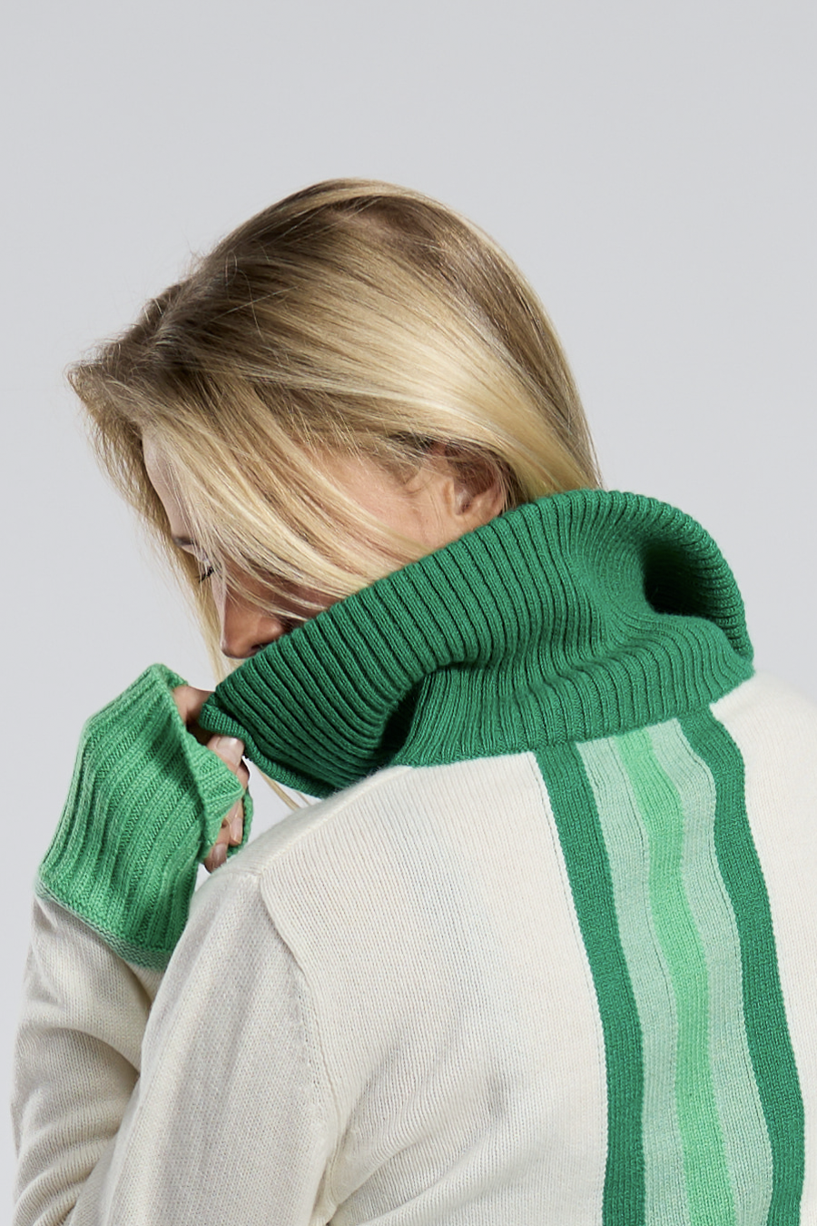 Laget av nydelig fiber i myk 100% naturlig, fornybar og nedbrytbar merinoull og kashmir. Genser: 10% kashmir/90% merinoull strikket i 5 gauge